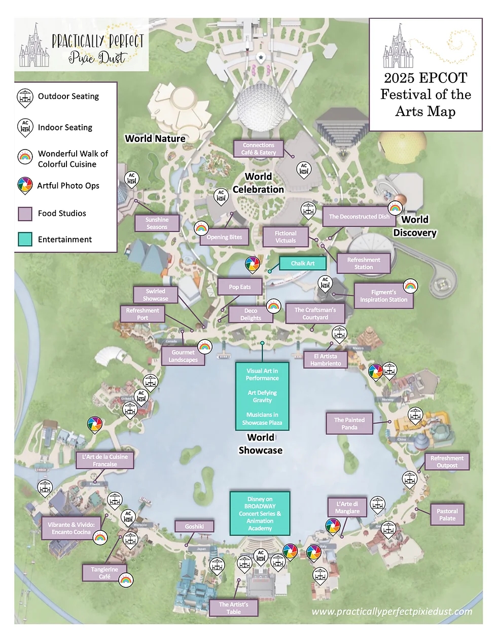 As you explore Epcot, take advantage of the various entertainment offerings, character meet and greets, and special events happening throughout the park. Our map will help you keep track of everything so you can make the most of your magical day at Epcot.
