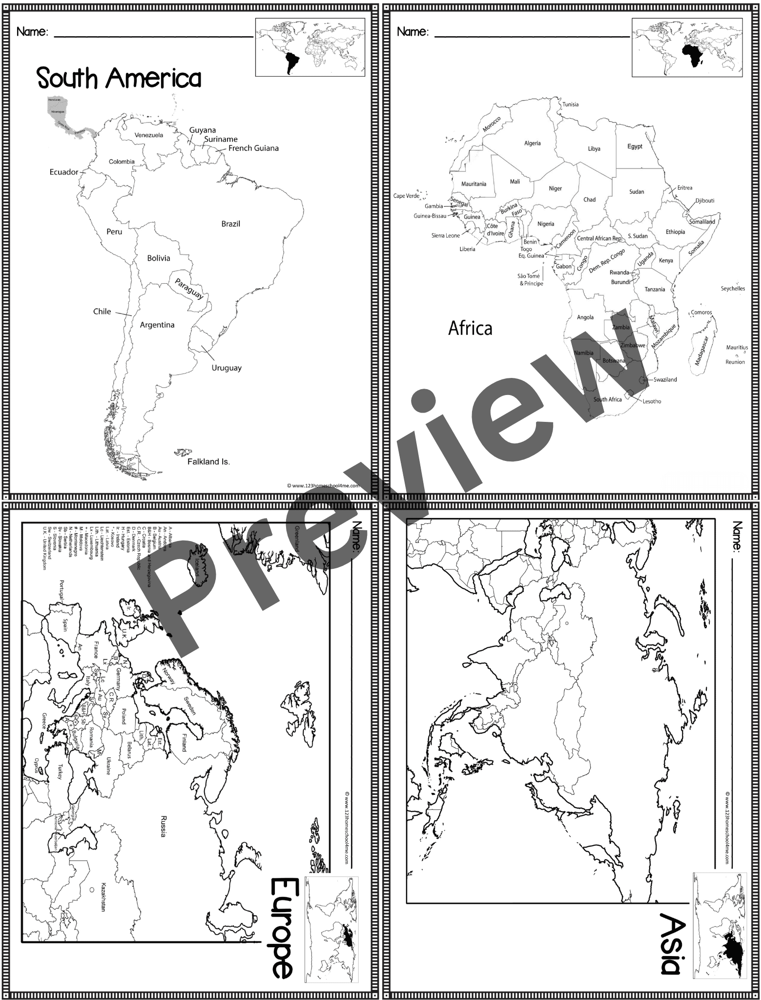 With a printable map of continents, you can easily locate the seven major landmasses of the world: Africa, Antarctica, Asia, Europe, North America, Australia, and South America. You can also see how they are connected and their relative sizes compared to one another.