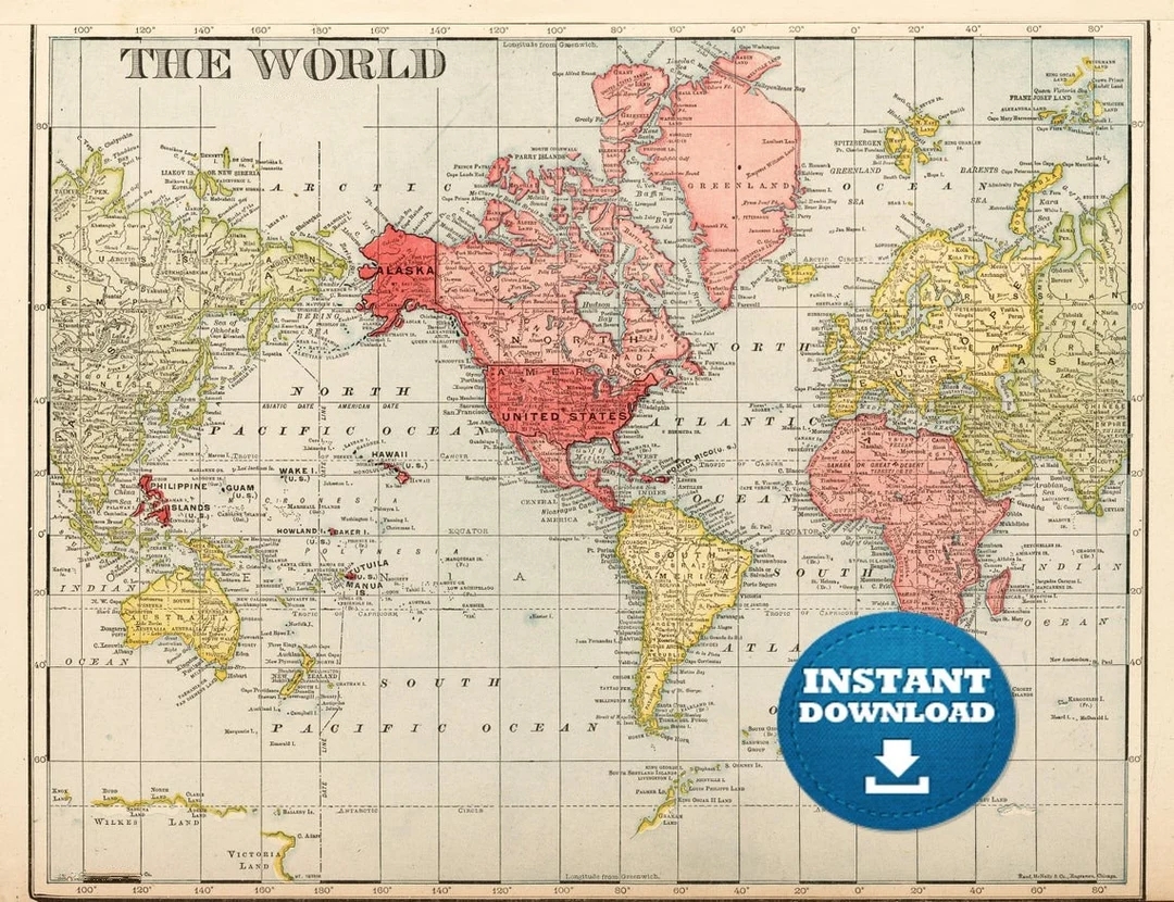 Digital Red yellow Vintage World Map Printable Download Vintage World Map Antique World Map Poster Map Etsy