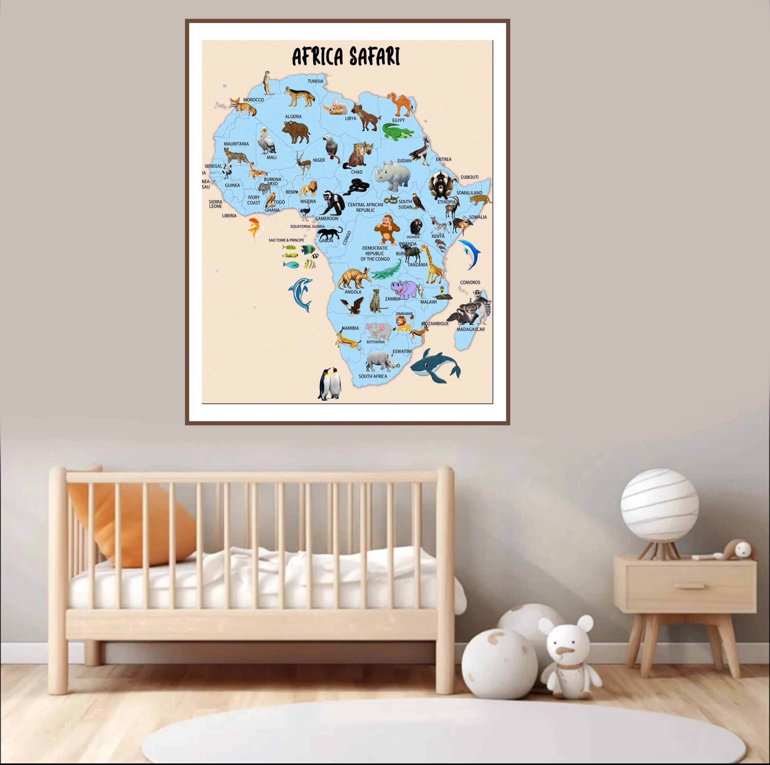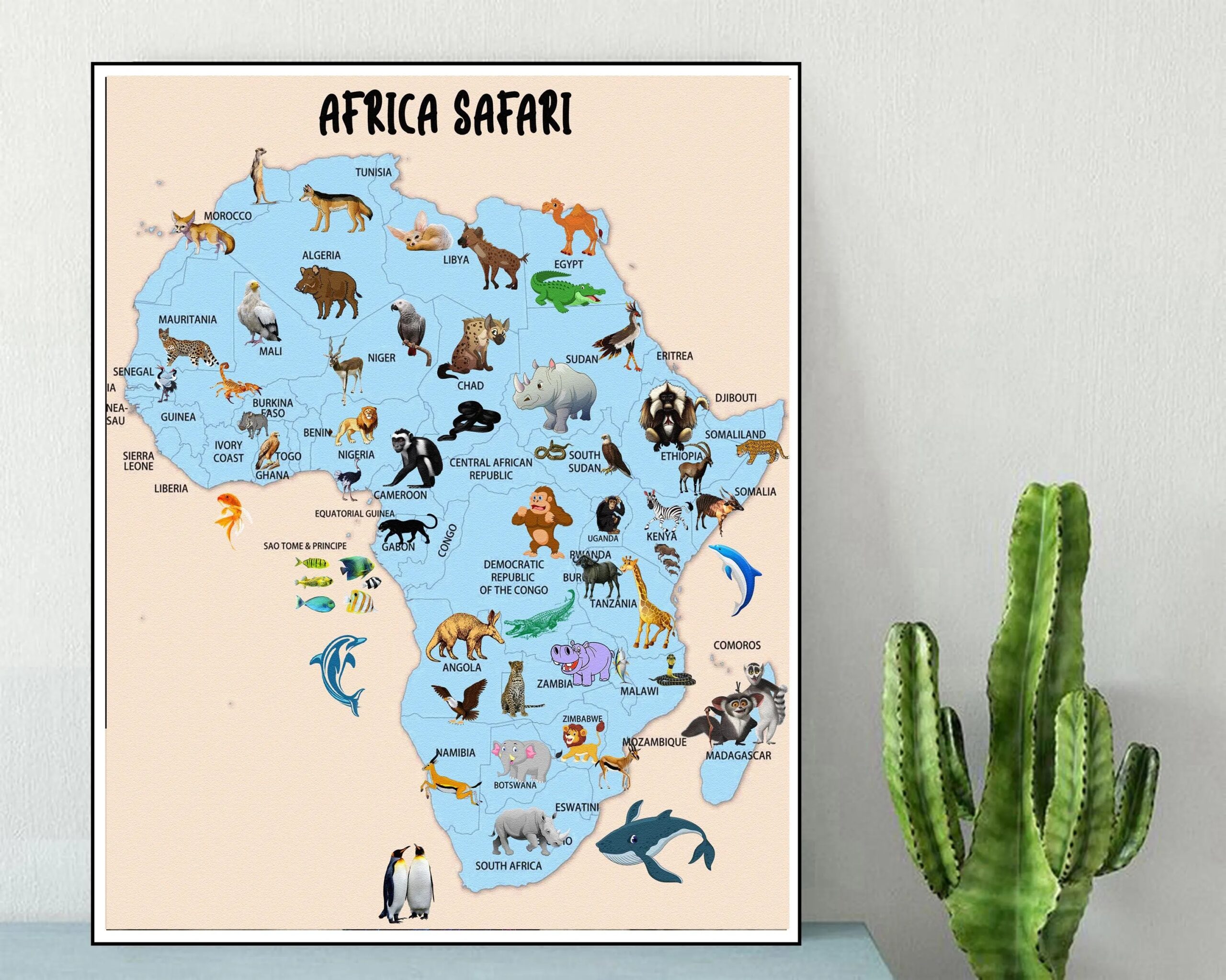 Africa Safari Map Printable Nursery Blue Africa Map Africa Wildlife Map Poster Kids Room Decor Africa Animals Print Classroom Nursery Decor Etsy
