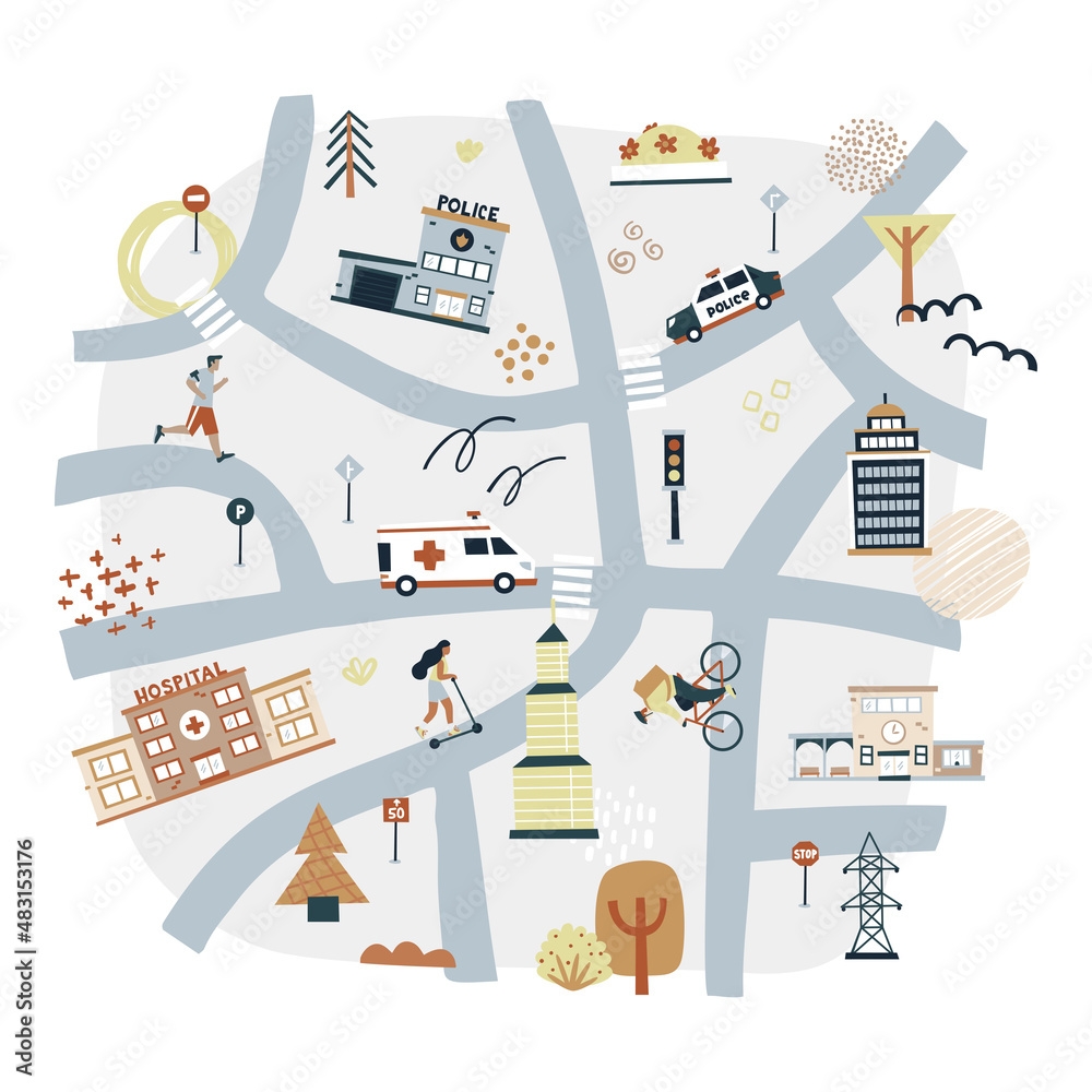 City Or Village With Roads Streets And Cars Cartoon Map Kids Nursery Poster Print Isolated On White Background Vector Illustration Stock Vector Adobe Stock