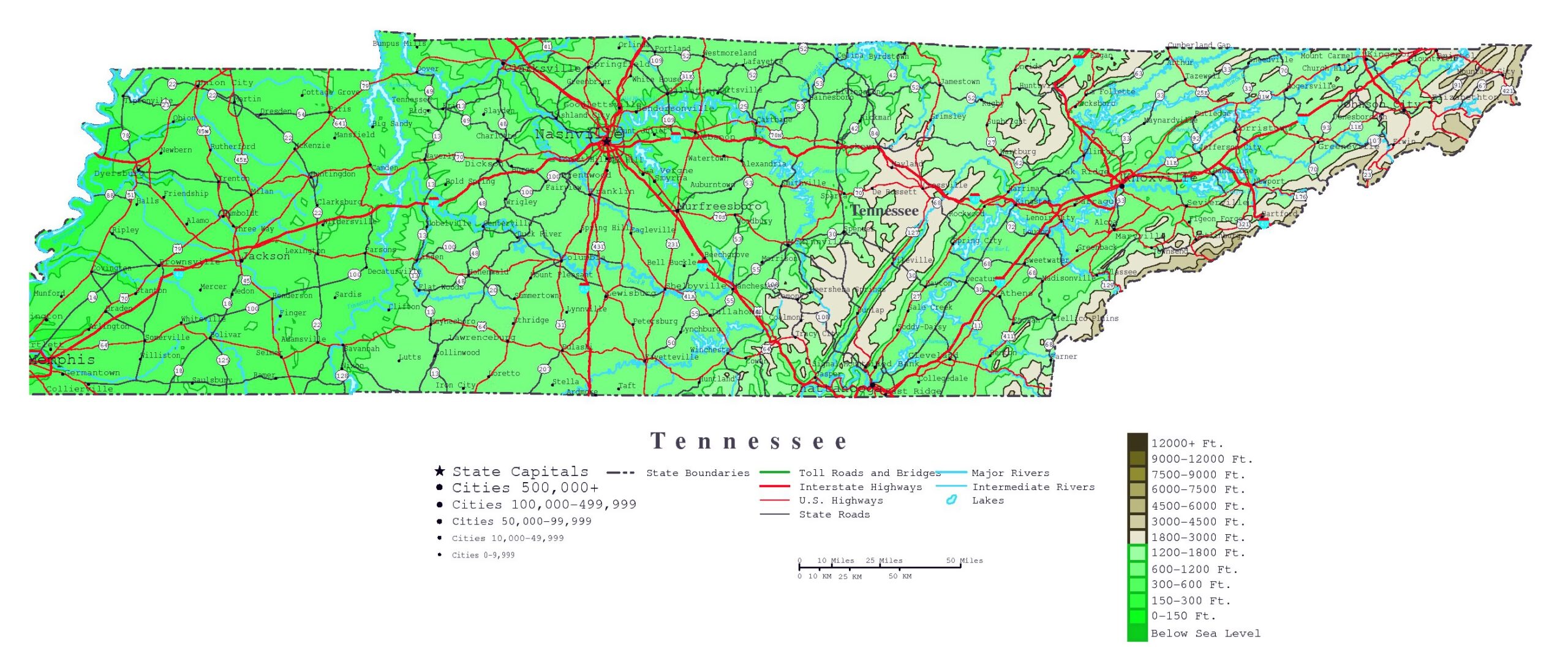 Large Detailed Elevation Map Of Tennessee State With Roads Highways And Cities Vidiani Maps Of All Countries In One Place