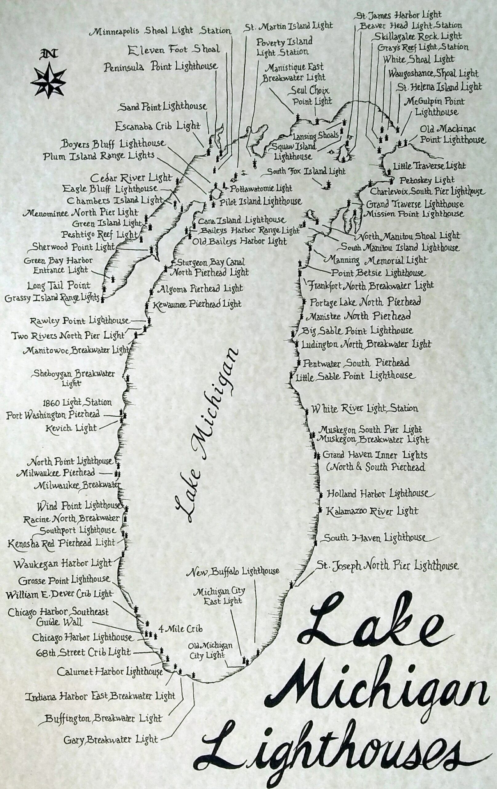 Lake Michigan Lighthouses Map Etsy