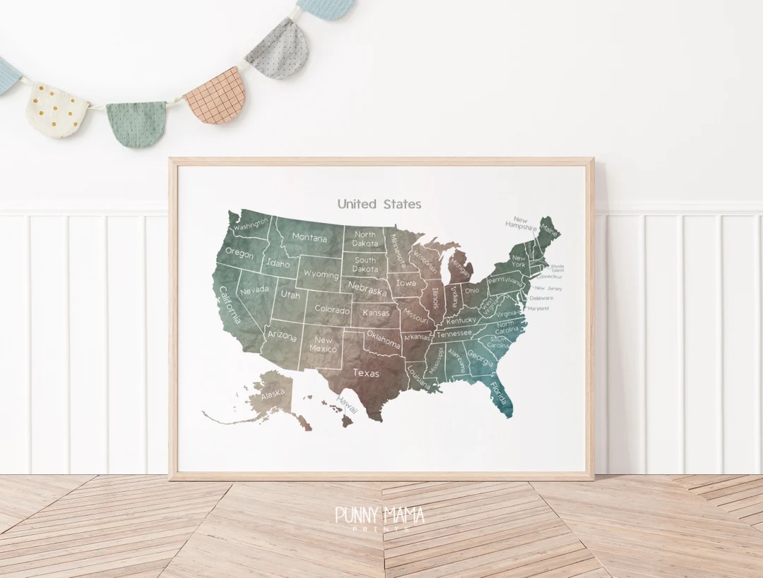 United States Of America Map Printable Neutral Earth Tones Kids Educational Classroom Wall Art Playroom Wall Art US Map Nursery Decor Print Etsy